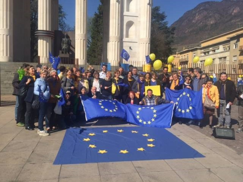 Ein gelungener Abschluss der Bildungsreise war die spontane Teilnahme am Flashmob der Grünen in Bozen zu den Feierlichkeiten der Römischen Verträge. Hier wurde nochmals eindrucksvoll unter dem ehemaligen faschistischen Siegesdenkmal ein Zeichen für ein friedliches, buntes, demokratisches Europa gesetzt!